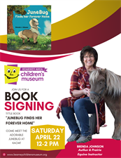 Join us for a book signing by local Author & Prairie Equine Instructor, Brenda Johnson with her book "JuneBug Finds Her Forever Home". Brenda and her adorable miniature pony, JuneBug will be at KACM June 22. 2023 from 12-2 pm
