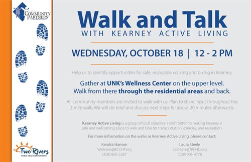 Buffalo County Community Partners and Two Rivers Public Health Department are co-leading a walk audit in the area surrounding UNK. Help us to identify opportunities for safe, enjoyable walking and biking in Kearney. All community members are invited to walk with us. Plan to share input throughout the 2-mile walk. We will de-brief and discuss next steps for about 30 minutes afterwards.